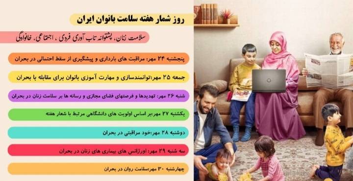 روزشمار هفته ملی سلامت بانوان  با تمرکز بر ابعاد مختلف سلامت  و خودمراقبتی از رسانه و خانواده تا محیط کار و گروه‌های آسیب‌پذیر، نقشه‌ای جامع برای ارتقای آگاهی و توانمندسازی جامعه در مواجهه با بحران‌ها ترسیم می‌کند.
